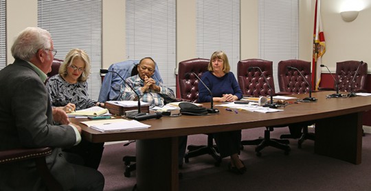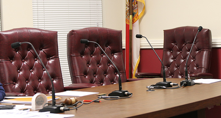 Pictured below: (L-R) Mayor Freddie McCall, Town Clerk, Leslie Gonzalz, council members Gary Riley and Anne Brooks, and three empty seats belonging to three absent council members. NorthEscambia.com photos, click to enlarge.