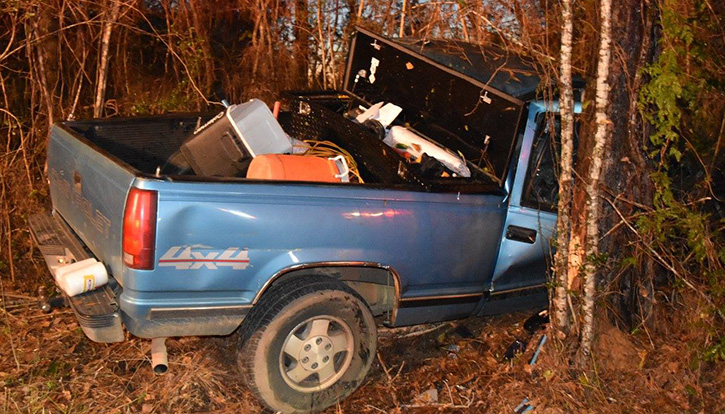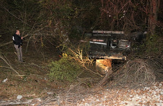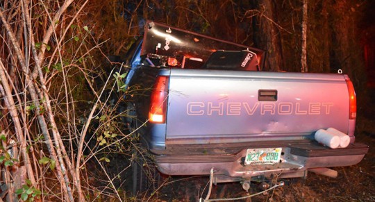 The driver was southbound on South Highway 99 when he failed to negotiate a 90-degree curve at a railroad crossing at South Highway 99 and Highway 97A. His Chevrolet 2500 pickup left the roadway and crashed about 15 feet down into a deep ravine, coming to rest almost upside down in the 5:38 a.m. crash.