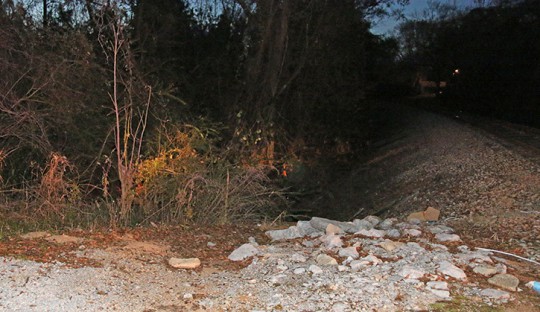 Pictured top and below: A driver crashed about 15 feet down into a ravine early Tuesday morning about eight miles from Walnut Hill. Pictured bottom: The truck was not visible from the top of the ravine. NorthEscambia.com photos, click to enlarge.