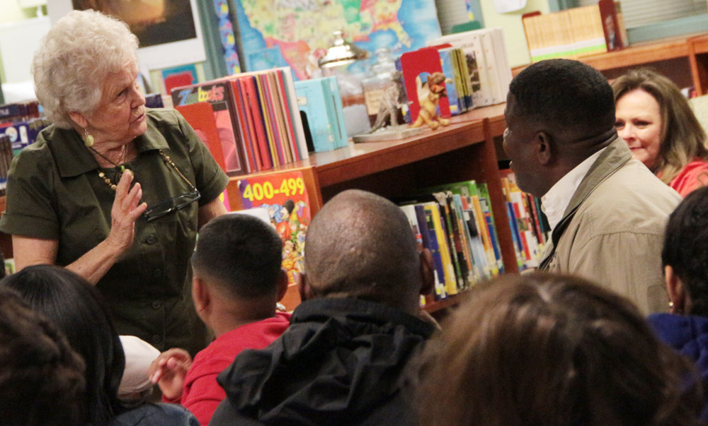 Pictured top: Ruby Amerson Well (standing, left) found Willie Fountain (right) his first-ever job at Bratt Elementary School. Pictured bottom inset: Bratt retiree Karen Brown. Pictured below: Bratt Elementary School Principal Karen Hall shares written stories about retirees during a luncheon Monday afternoon. NorthEscambia.com photos, click to enlarge.