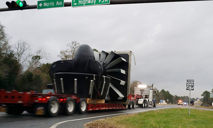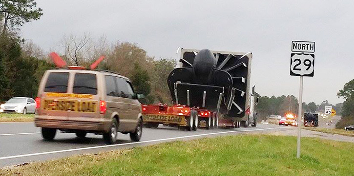 Morning drivers on Highway 29 through North Escambia were greeted by a couple of giant turbine pieces under escort by the Florida Highway Patrol. Details of the transport were not released in advance. Reader submitted photos for NorthEscambia.com, click to enlarge.