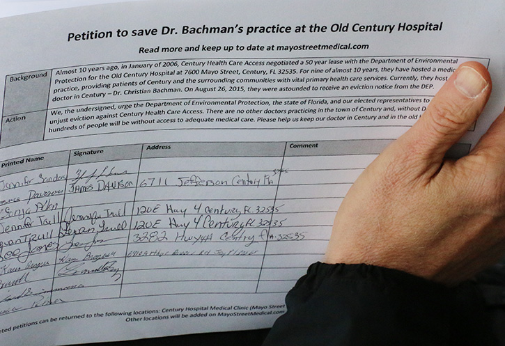 Century’s only doctor has been embroiled in a fight with a state agency to continue his medical practice from the old Century Hospital building. In a letter dated August 26, 2015, Century Health Care Access (CHCA) and Dr. Bachman, president of CHCA and physician for Mayo Street Medical, were ordered to vacate the facility by September 30, 2015, by the Florida Department of Environmental Protection, current owners of 25,000 square foot building on Mayo Street.