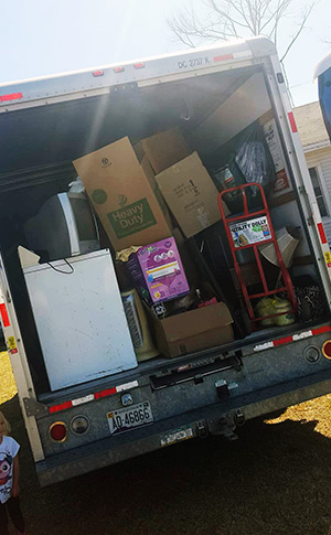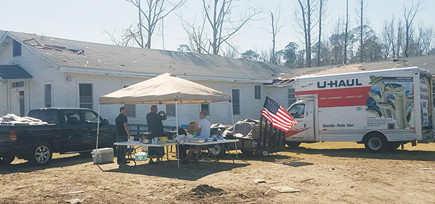 The group arrived at the damaged Wesley Chapel on Jefferson Avenue with a donated U-Haul truck and a trailer with 3,000 pounds of non-perishables, household goods and more for the Century tornado victim, all donated by people in the Pensacola area. And they also held a little fish fry for those in need.