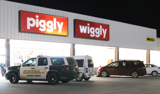 He reportedly fled in a black Ford F-150 pickup truck with a busted-out window driven by a white female in a hoodie. They were chased briefly by a store employee north on Highway 97 across the state line into Atmore. There were no injuries reported.