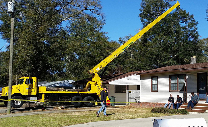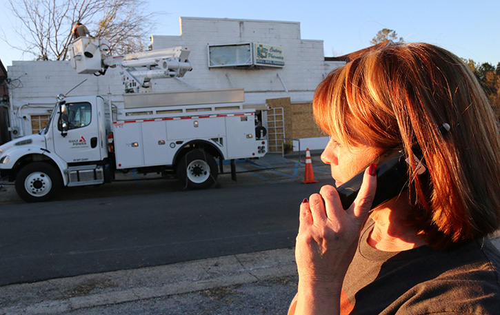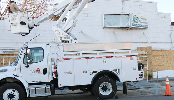 Pictured top: Century Pharmacy owner Julie Booth-Moran talks to a customer on the phone as she watches as Gulf Power work to restore electric service to the Mayo Street business in Century late Wednesday afternoon. NorthEscambia.com photos, click to enlarge.