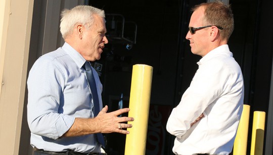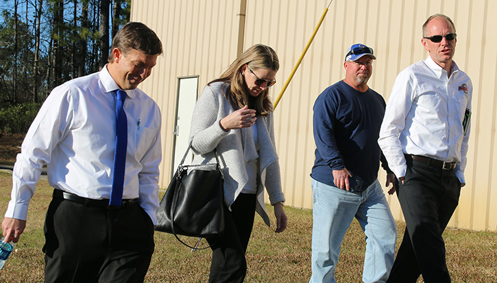 Pictured top: Escambia County Administrator Jack Brown (left) discusses tornado recovery with Director of the Florida Division of Emergency Management Bryan Koon Wednesday afternoon in Century. Pictured below: (L-R) Escambia County Commissioner Steven Barry, Florida Department of Economic Development Director Cissy Proctor, Century Council President Ben Boutwell and Florida Division of Emergency Management Bryan Koon Wednesday afternoon at the Century Fire Station, which was being used as a command center. NorthEscambia.com photos, click to enlarge.