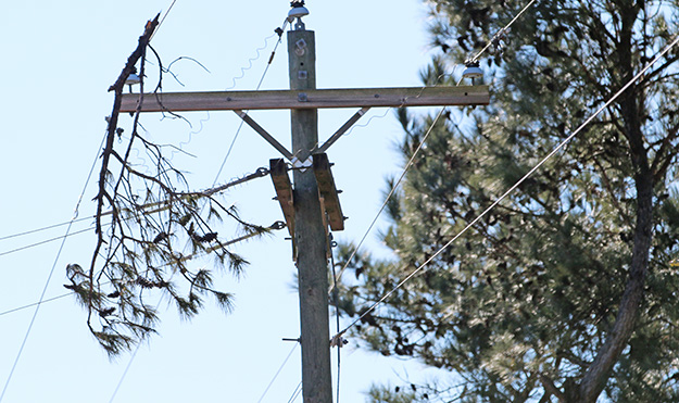 Gusty winds blew a limb into a power line in Walnut Hill Tuesday morning near the Walnut Hill Fire Station on Highway 97. That caused a power outage for a large number of Escambia River Electric Cooperative customers in the Walnut Hill area, including Ernest Ward Middle School. NorthEscambia.com photo, click to enlarge.