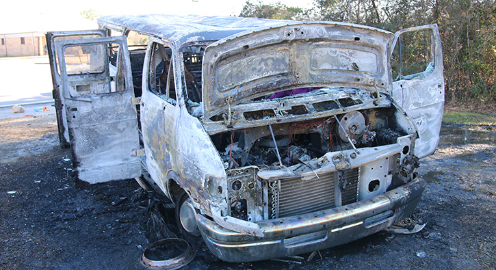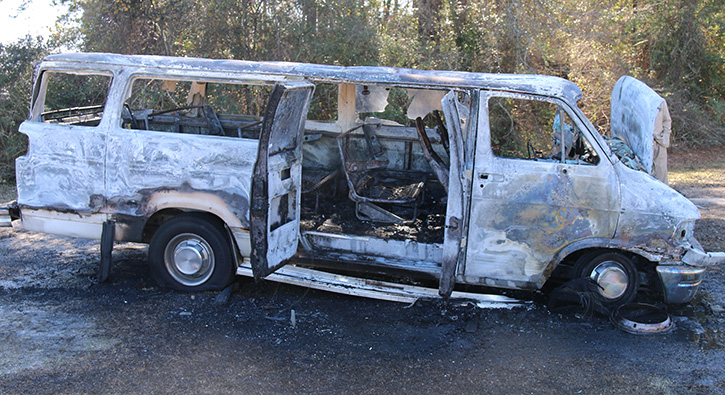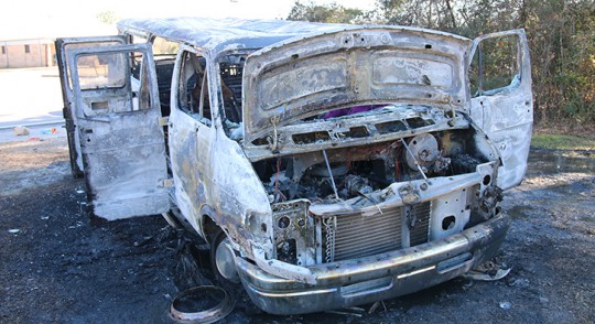 A church van went up in flames Sunday afternoon in Century. The Greater Union Missionary Church van burst into flames as the driver was pulling off North Century Boulevard at the New Life Christian Center. There were no passengers in the van at the time of the fire. Reader submitted photo (top) and NorthEscambia.com photos (below), click to enlarge.