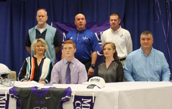 Jay High School’s Victor Mishoe signed a football letter of intent Wednesday with Millsaps College in Jackson, MS – a NCAA Division III school Pictured: (L-R, seated) Evelyn Jordan, Victor Mishoe, Christy Cassady, Jack Floyd, (back, L-R) Track Coach Madison Whitfield, Athletic Director Lance Youngblood and Head Football Coach Kent Smith. Submitted photo for NorthEscambia.com, click to enlarge.