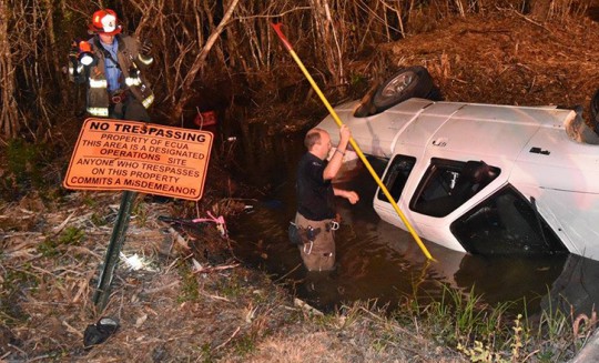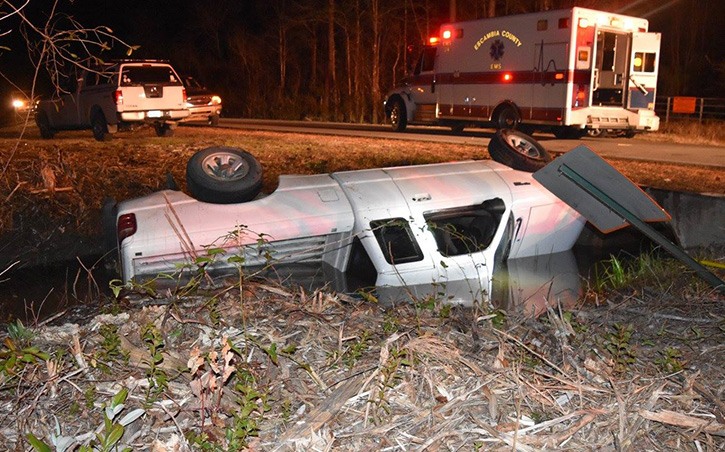 A driver as no where to be found when a pickup truck was found flipped into a water-filled ditch on Becks Lake Road in Cantonment Sunday night.