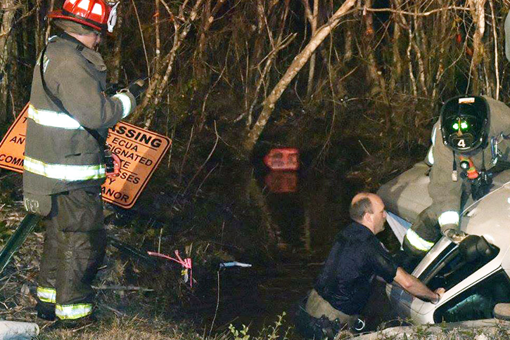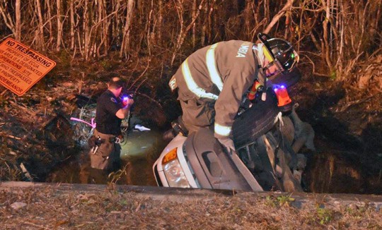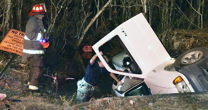 Firefighters search the truck and ditch for any signs of a victim, but nothing was found. It appeared the driver had fled the scene before the arrival of first responders.