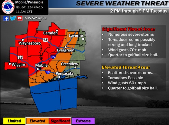 There is an elevated threat of severe weather for Tuesday afternoon and Tuesday night for the North Escambia area, while a small portion of the area is in the significant threat area (see graphic). Here is your official North Escambia area forecast: