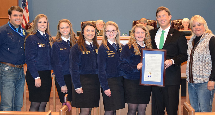 It’s National FFA Week in Escambia County, according to a proclamation issued by the Escambia County Commission. The commission commended the county’s FFA chapters, members, parents and advisors and all who support agriscience education and the development of future leaders. Pictured at the county commission proclamation presentation from the Tate High School FFA are Austin Courson, Rachel Grammer, Tori Kelson, Cora Andrews, Patra Miller, Amber Neal, Commissioner Steven Berry and Melissa Gibbs. Photo for NorthEscambia.com, click to enlarge.