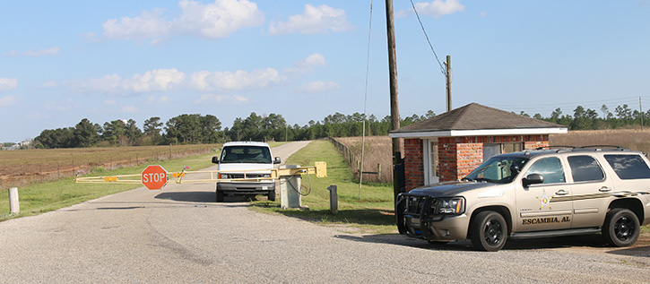 Pictured top: Holman Prison in Atmore Picture below: Visitors to Holman Prison in Atmore were stopped at a guard gate along Highway 21 on Monday as the facility remained under lockdown. NorthEscambia.com photos.