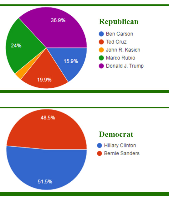Among the students voting Democratic, Hillary Clinton received 51.5 percent of the vote, and Bernie Sanders had 48.5 percent.