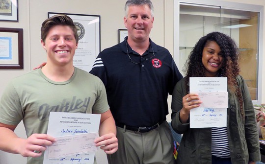 Tate High School has named students of the month for February. They are David Faircloth and Demiyah Stonewall, pictured with Principal Rich Shackle. Photo for NorthEscambia.com, click to enlarge.