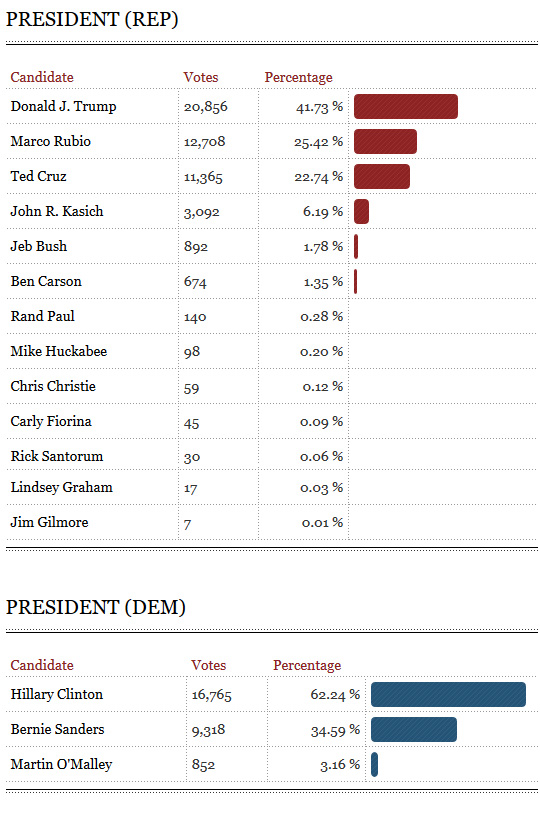 On the Democratic side, former Secretary of State Hillary Clinton routed U.S. Sen. Bernie Sanders of Vermont. Clinton had more than 64 percent of the vote, to 33 percent for Sanders.
