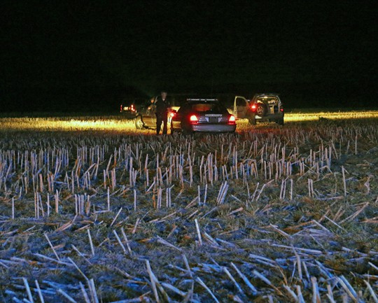 Pictured above and bottom: A police chase ended with shots fired in this field north of Atmore Tuesday night. Pictured below: Winston David Howell of Lucedale, MS, was taken into custody at the scene. He is pictured being questioned by Escambia County (AL) Chief Deputy Mike Lambert. NorthEcambia.com photos, click to enlarge.
