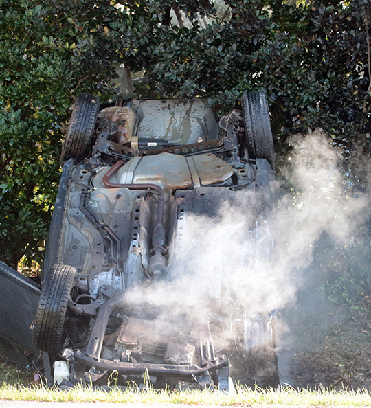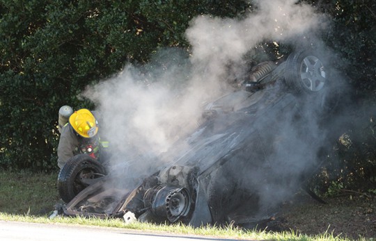 Pictured top: A volunteer firefighter checks a still smoldering car for additional victims following a single vehicle rollover crash on Highway 97 in Molino Sunday morning. Pictured inset and below: There were no injuries in the crash. NorthEscambia.com photos, click to enlarge.
