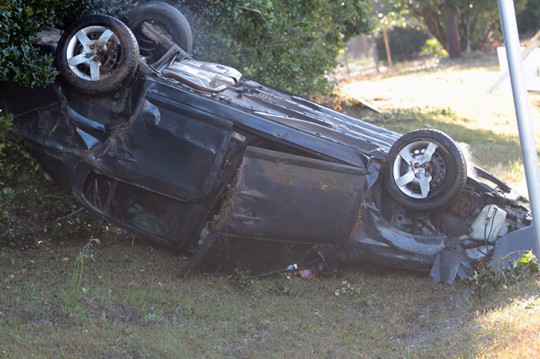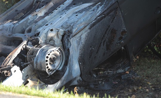 The female driver of a northbound car lost control just north of Gibson Road, ran into the ditch, hit a culvert and went airborne before her vehicle came to rest upside down in a ditch about 8:50 a.m.. The driver, who was wearing a seat belt, was able to crawl out of the vehicle before it became engulfed in flames. There were no passengers in the vehicle.
