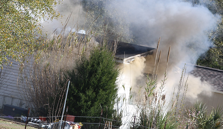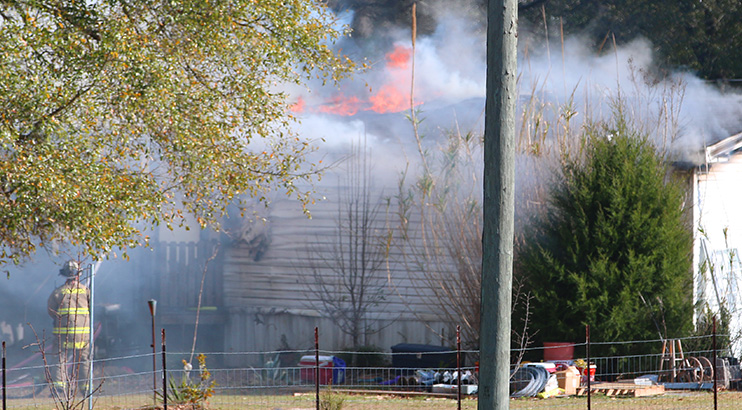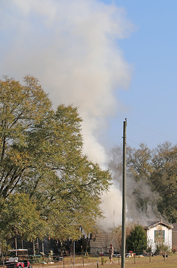 Pictured top: Fire breaks through the roof a mobile home on West Highway 4 near Century Monday afternoon. Pictured inset and below: Heavy smoke billows from the mobile home. NorthEscambia.com photos, click to enlarge.