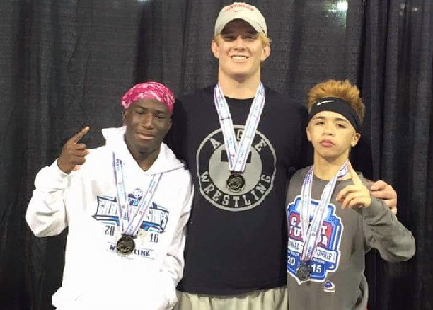 Three Tate High School Aggie wrestling team members placed recently at state. From the left, Alex Porter placed sixth; Gaven McAnally placed fifth, and Jacob Cochran placed sixth. Overall, the Aggies team placed 14th in the state. Submitted photo for NorthEscambia.com, click to enlarge.
