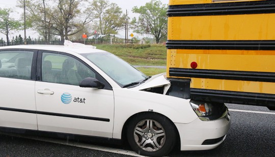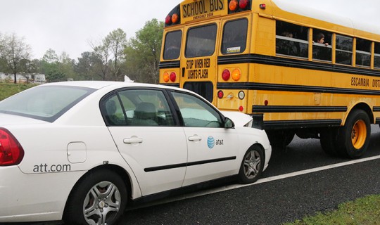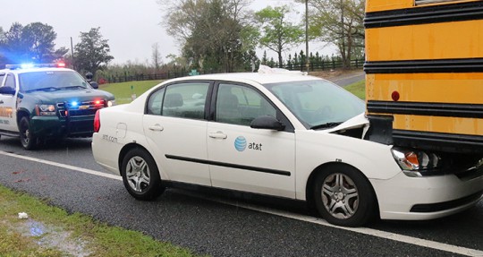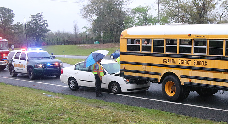 According to the Florida Highway Patrol, 60-year old Steven K. Smith of Montgomery was northbound on Highway 29 near Elsie Davis Road in a Chevrolet Malibu when he braked on the wet roadway and slid into the a school bus. The bus, driven by 53-year old Linda C. Flowers of Century, was stopped with lights activated.