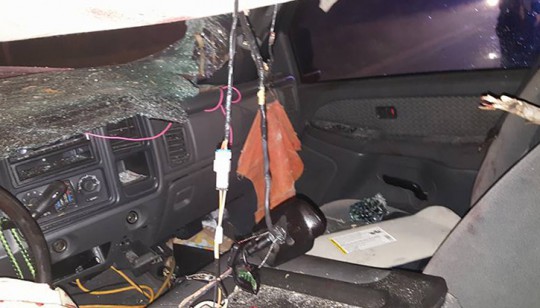 Pictured above and below: A pickup truck driver collided with a log truck in Cantonment. Pictured top photo below: Logs entered the cab of the truck, note the stick in the driver’s seat. Courtesy photos for NorthEscambia.com, click to enlarge.
