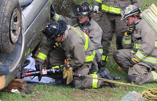 Pictured above and below: Firefighters use the Jaws of Life to free a driver following a crash on Highway 97 in Molino. The white sheet is protecting the occupant of of the truck from glass and debris. Pictured below: The accident trapped the driver and caused power to be cut for part of the Molino area. NorthEscambia.com photos, click to enlarge.