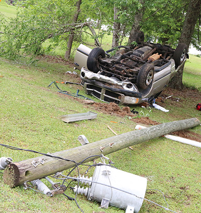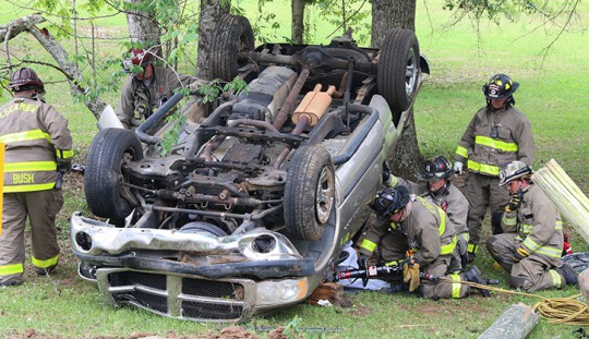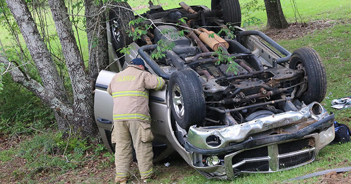 The driver of a pickup truck lost control for an unknown reason on Highway 97 north of Gibson Road, ran off the roadway, clipped a power pole and rolled the vehicle upside down into several trees. The driver was partially ejected from the pickup and trapped. Firefighters were forced to use the Jaws of Life to free the man from the overturned truck. He was transported by ambulance to a Pensacola hospital in unknown condition.