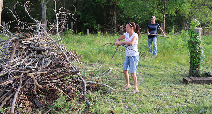 Pictured above: The owners of this tornado damaged home in Century have received code violations for debris, broken windows, a blue tarped roof and overgrowth. Pictured immediately below: Owners Wade and Mary Barnes work Tuesday afternoon to pick up limbs on their property and place them in a pile for which they plan to get a burn permit. Pictured below: Other views of the damaged rental house. Pictured bottom: Other homes in the neighborhood are also covered with blue tarps. NorthEscambia.com photos, click to enlarge.