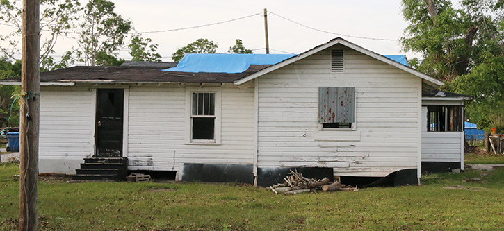 Other neighboring homes also have blue tarps on the roof, trees are still down in yards and some of the nearby structures are destroyed, now just piles of rubble.