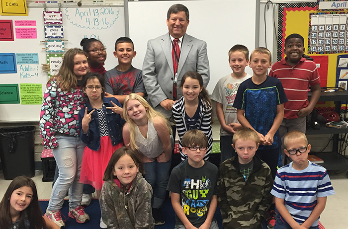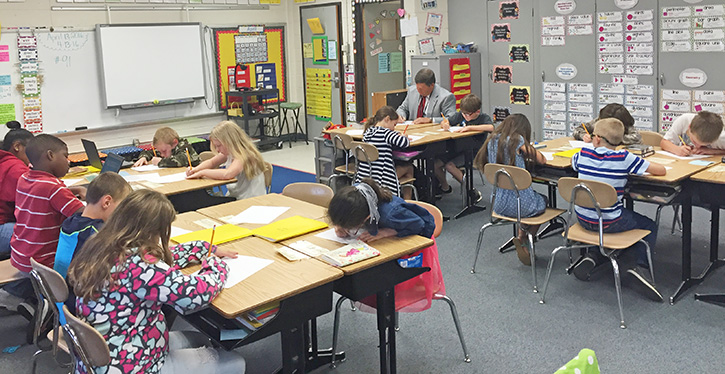 Adult visitors need to be ready if they visit a third grade classroom at Jim Allen Elementary School. They will find themselves in a battle as they try to complete the “Multiplication Challenge”, as did recent visitor Malcolm Thomas, Escambia superintendent of schools. Submitted photos for NorthEscambia.com, click to enlarge.