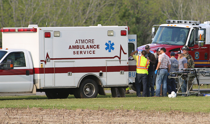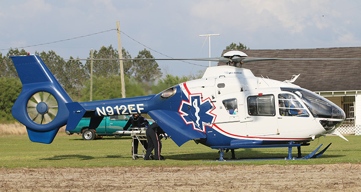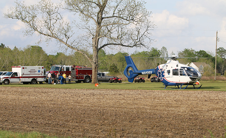 Pictured top: A 77-year old male was injured in the ATV accident in pasture on Oakshade Road. Pictured below: The victim was airlifted to Sacred Heart Hospital in Pensacola as a trauma alert. NorthEscambia.com photos, click to enlarge.