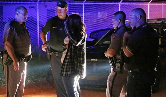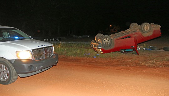 Pictured above and inset: A high speed chase by Atmore Police into Florida ended with this rollover crash on a dirt road near Bratt Sunday night. Pictured immediately below: The female driver (in a plaid shirt) is questioned by law enforcement after the accident. Pictured bottom: More of the accident scene. NorthEscambia.com photos, click to enlarge.