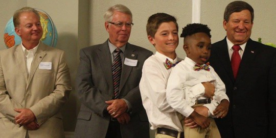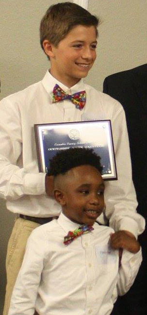 Pictured top: (L-R) Escambia County School Board members Jeff Bergosh and Bill Slayton, Grant Gill and his friend Dorian, and Escambia School Superintendent Malcolm Thomas. Pictured inset: Escambia County School District Outstanding Student Volunteer of the Year Grant Gill from Ransom Middle School and his special friend Dorian. Photos for NorthEscambia.com, click to enlarge.