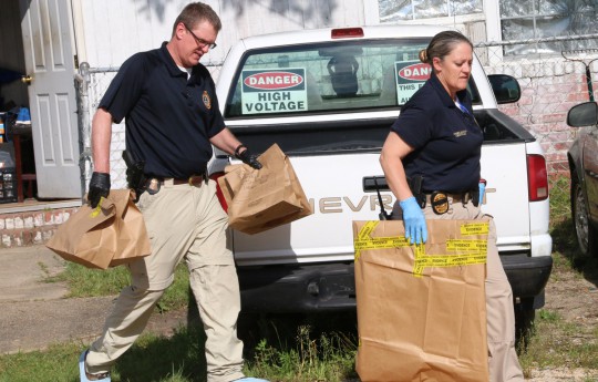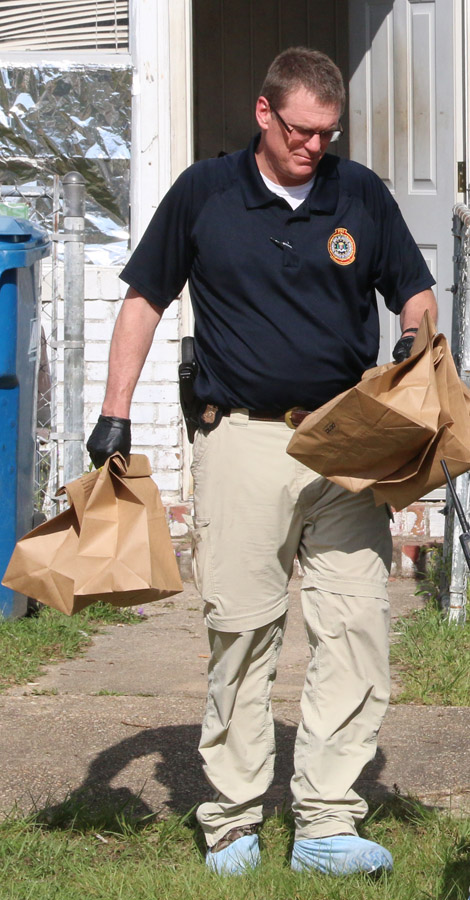 Pictured top: A Flomaton Police officer (right) and a FBI agent removed evidence from a home on Lender Street in Flomaton Friday afternoon. Pictured inset: An FBI agent removes additional evidence. Pictured below: A U.S. Marshal watches over the scene where a search warrant was executed Friday afternoon. NorthEscambia.com exclusive photos, click to enlarge.