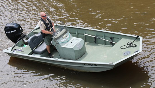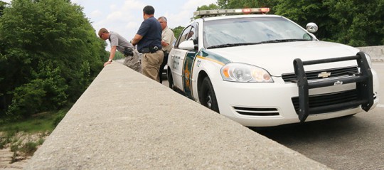 Pictured top and below: Authorities search the Escambia River below the Highway 4 bridge for a shotgun used by an attempted murder suspect. NorthEscambia.com photos, click to enlarge.