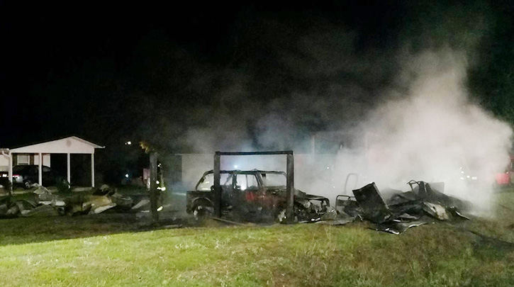 An early morning fire destroyed a large detached garage and at least one vehicle in Cantonment.