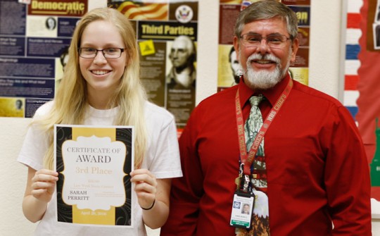 Pictured: Law Week Student Essay Contest third place winner Sarah Perritt and teacher James Moretz. Photo for NorthEscambia.com, click to enlarge.