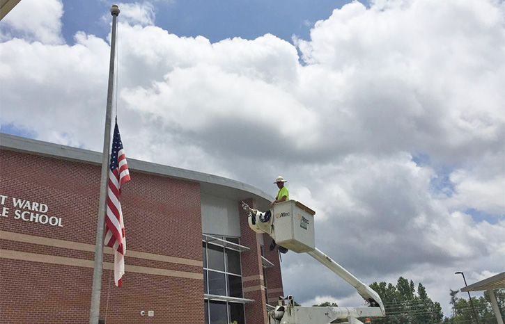 A new solar power flag light now sits atop the flagpole at Ernest Ward Middle School. The light was donated as project of the school’s Teens For Christ organization. Escambia River Electric Cooperative donated the use of a bucket truck and the labor to install the light. EREC is an Ernest Ward Middle School Partner in Education. Photos for NorthEscambia.com, click to enlarge.