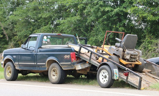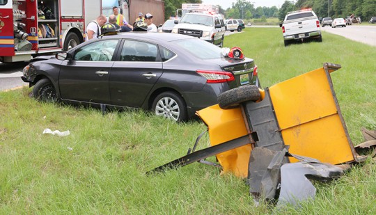 Just after 10 a.m., a passenger car collided with a utility trailer being pulled by a pickup truck on Highway 29 at Morgan Cemetery Road, just north of Highway 97. The utility trailer was loaded with lawn equipment.