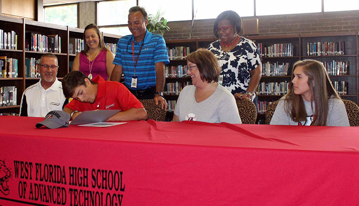 West Florida High School senior Kris Reber of Molino signed Monday to play baseball with LaGrange CollegeĀ in Lagrange, GA. Among those joining him for the signing were WFHS Athletic Director and Head Coach Mark Conti, his brother Zach Reber, sister Olivia Reber and parents TJ and Melissa Reber. Photos for NorthEscambia.com, click to enlarge.