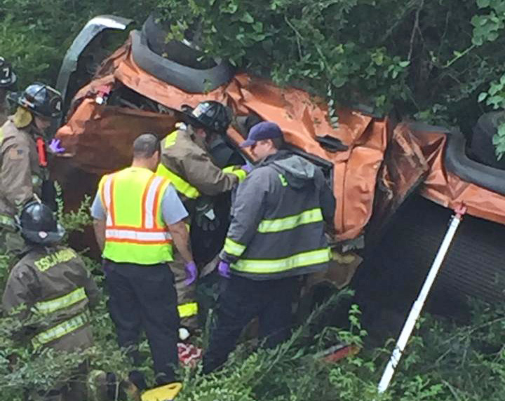 One person was injured when he flipped his truck off the Eleven Mile Creek Bridge on East Kingsfield Road late Sunday morning. After being extricated by firefighters, the driver was transported by ambulance to a Pensacola area hospital. The driver’s name and condition have not been released. The accident remains under investigation by the Florida Highway Patrol. Photo for NorthEscambia.com, click to enlarge.