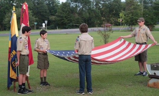 Three Boy Scouts unfolded an American Flag Tuesday evening for the last time on the front lawn of Aldersgate United Methodist Church in Molino to present its colors. A group of Scouts gathered around along with their parents and said the Pledge of Allegiance to the flag…which was faded, soiled and even torn.