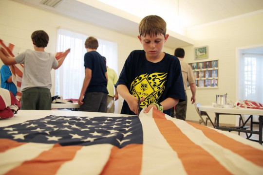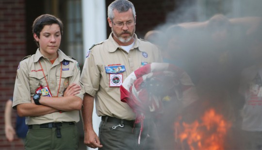 Cubmaster of Pack 430, Kevin Danforth, said the flag was first used to cover a coffin during a military funeral, and it was then flown in front of the church for several months. Now it was time for the tattered flag to be retired — burned after being cut into pieces of cloth. Quietly, the scouts cut the flag, leaving leaving the blue star field intact to symbolize an unbroken union.