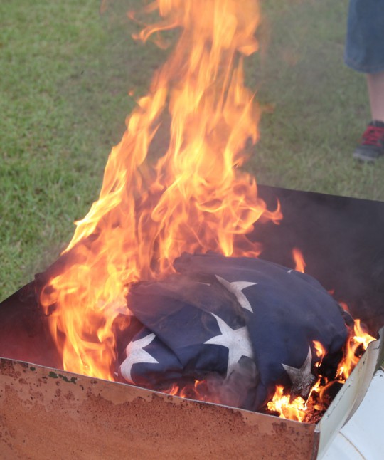 Then the flag was placed, blue star field first followed by the stripes, into a fire burning in a half barrel. The crowd watched as the fire consumed the flag remnants, and they sang “God Bless America”. The scouts then cut numerous other worn American Flags into pieces which were also incinerated.