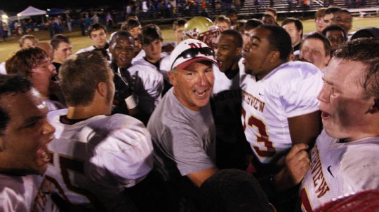 Pictured top: Northview Head Coach Sid Wheatley. Pictured inset: Wheatley receives of a copy of the Congressional Record where the Chiefs were honored on the floor of the U.S. House and a flag that flew over the White House in their honor after winning a Class 1A state championship in 2012. Pictured below: Wheatley leads his Chiefs to a 2016 Spring Game win over Jay. Pictured bottom: Wheatley’s 2012 state championship team. NorthEscambia.com photos, click to enlarge.