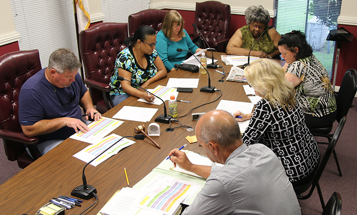 The Town of Century continued a series of budget workshops Thursday afternoon as they work toward preparing their fiscal year 2016-17 budget. The next budget workshop is scheduled for Thursday, July 28 with additional workshops to be scheduled. Pictured: (clockwise, from left) Council President Ben Boutwell; council members Sandra McMurray Jackson, Ann Brooks, Annie Savage; Clerk of Finance Kristina Wood; Town Clerk Leslie Gonzalez and accountant Robert Hudson. Century Mayor Freddie McCall was also present at the meeting. Pictured left: Hudson reviews financial documents. NorthEscambia.com photo, click to enlarge.