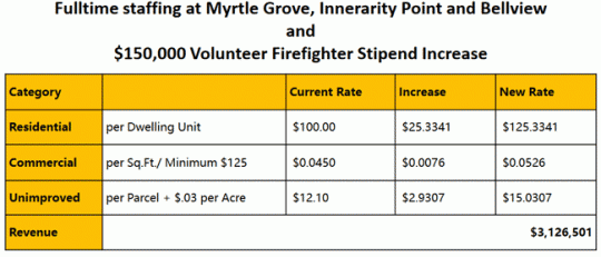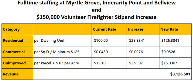 The proceeds from the extra $25 per year municipal services benefit unit assessment (MSBU) will fund 24/7 paid firefighters at the Myrtle Grove, Innerarity Point and Bellview stations, plus fund $150,000 in volunteer firefighter stipend increases.